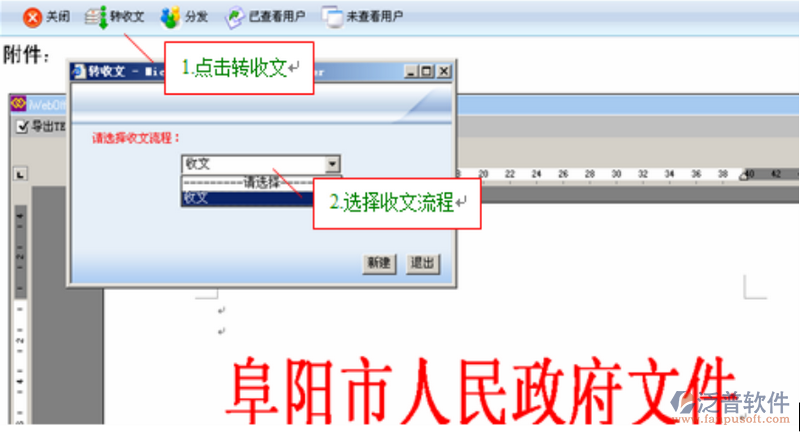 Ø 轉(zhuǎn)收文——將所收到的文件轉(zhuǎn)為收文,完成相關(guān)的批示辦理過程。如下圖所示:點(diǎn)擊“轉(zhuǎn)收文”按鈕,在下拉框中選擇相關(guān)的收文流程,點(diǎn)擊“新建”,系統(tǒng)便會彈出相應(yīng)的收文處理標(biāo)簽,“標(biāo)題”、“文號”等相關(guān)字段內(nèi)容也會自動提取到收文標(biāo)簽中。