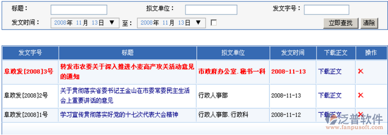 如圖所示,用戶可以通過在輸入標(biāo)題、擬文單位、發(fā)文字號、發(fā)文時(shí)間等條件搜索出相關(guān)文件。