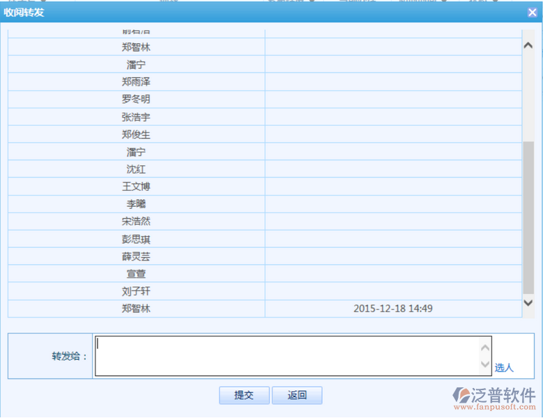 轉(zhuǎn)發(fā),在已有的收閱之外,添加收閱人。點擊右下角“選人”連接,獲取收閱人,點擊提交即可。
