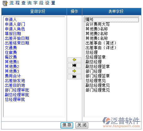 在彈出的“流程查詢字段設(shè)置”頁面里有“查詢字段”和備選“表單字段”區(qū)域,鼠標(biāo)雙擊字段名稱就可以左右移動,也可以點(diǎn)擊中間的箭頭來設(shè)置調(diào)整。