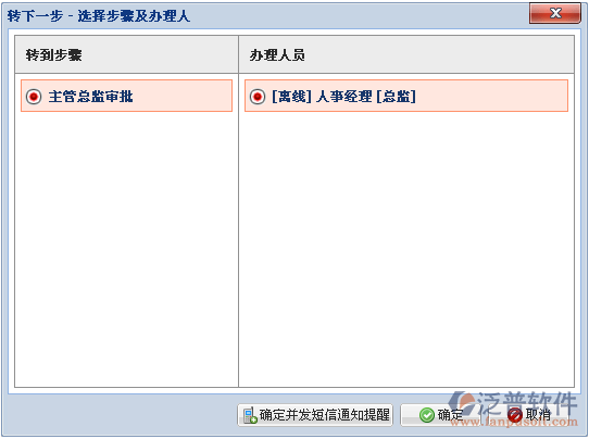 轉(zhuǎn)下一步步驟[經(jīng)辦角色]:[主任]對(duì)總經(jīng)理助理發(fā)起的請(qǐng)假申請(qǐng)流程,審批步驟為[部門負(fù)責(zé)人審批],由條件判斷轉(zhuǎn)下一步為[主管總監(jiān)審批],再由[主管總監(jiān)審批]步驟的經(jīng)辦角色,判斷出經(jīng)辦人為[人事經(jīng)理]: