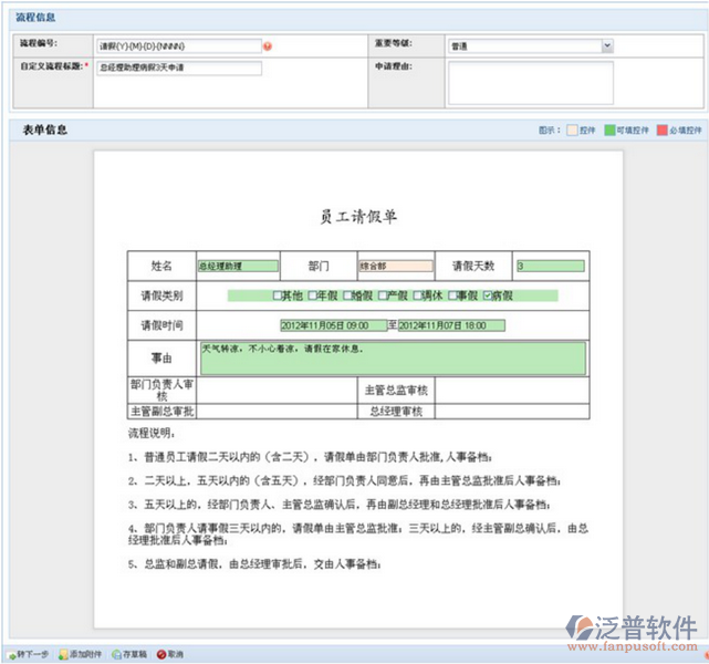 功能介紹:我由總經(jīng)理助理發(fā)起請(qǐng)假流程,請(qǐng)假天數(shù)為3天,轉(zhuǎn)下一步,