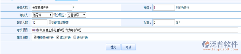 注:這里有個(gè)權(quán)重的選項(xiàng),即表示每個(gè)考核步驟分占總考核分的百分比。勾選查看前步評(píng)分,在執(zhí)行考核評(píng)分時(shí),會(huì)自動(dòng)顯示上一步的評(píng)分分?jǐn)?shù)