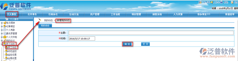 在【員工動(dòng)態(tài)】界面,點(diǎn)擊右上角的增加后,顯示如下界面,新增動(dòng)態(tài),如下圖所示: