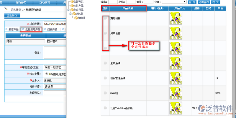 在申請采購計劃中,可以新增采購的產(chǎn)品、也可以新增生產(chǎn)需要用到的物料。新增的產(chǎn)品和物料都從我們已經(jīng)錄入的數(shù)據(jù)中進(jìn)行選擇。