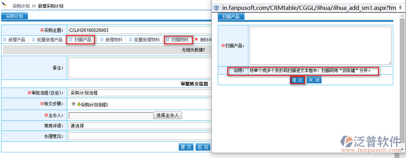另外,還可以通過掃描產(chǎn)品、物料的方式,對產(chǎn)品、物料進(jìn)行選擇。單擊掃描、掃描物料,彈出掃描頁面。按照說明提示來