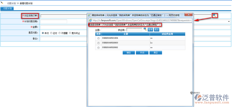 單擊【新增】按鈕,新增一個(gè)付款計(jì)劃,進(jìn)入付款計(jì)劃頁(yè)面。如下圖所示,選擇對(duì)應(yīng)已經(jīng)通過(guò)審批的訂單。
