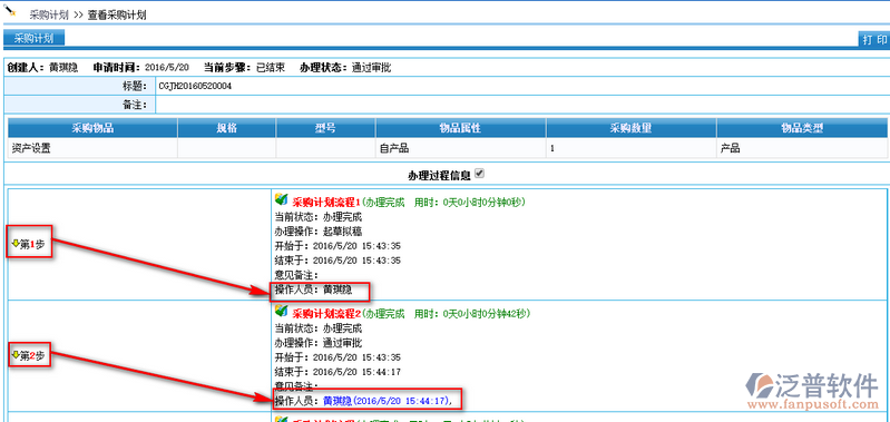 點擊名稱,查看詳細的采購計劃。下面的辦理過程信息中,有每一步審批的人員和時間。