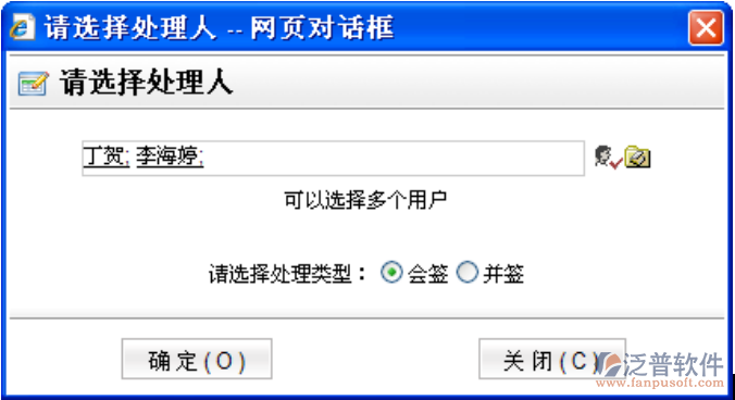 2. 選擇多個(gè)會(huì)簽人員,點(diǎn)擊“確定”按鈕完成會(huì)簽操作。會(huì)簽后,表單流轉(zhuǎn)至被會(huì)簽人員。顯示在被會(huì)簽人員的“待辦事項(xiàng)”中。