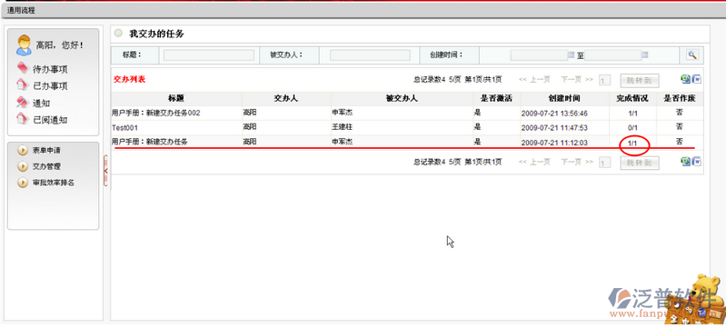 5. 交辦任務(wù)完成后,交辦人“我交辦的任務(wù)”列表中,“完成情況”已經(jīng)更新,如圖: