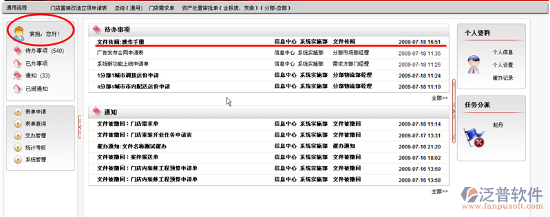 2. 選擇傳閱人(一個或多個),點擊“確定”按鈕,表單流轉至下一審批環(huán)節(jié),同時被傳閱人在“待辦事項”列表中接收到傳閱記錄。如圖: