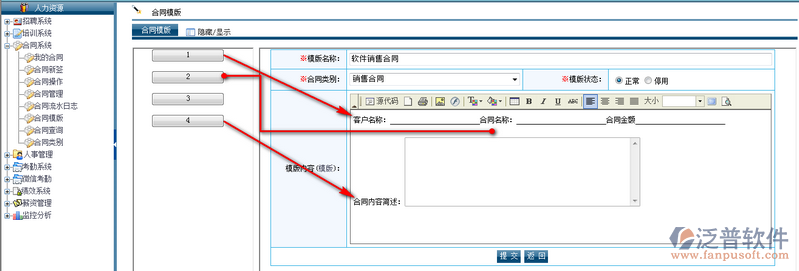 1、選擇泛普軟件的合同管理系統(tǒng),首選做好合同管理模塊的基礎(chǔ)設(shè)置,如合同類別設(shè)置,可以將企業(yè)常用合同類型進(jìn)行設(shè)置,即人事合同、銷售合同等,每一個合同類型對應(yīng)的合同模版,需要將合同模版設(shè)置好,合同模版主要存放合同條款中的重要信息作為輸入窗口,錄入重點條款信息以及方便后期按照合同內(nèi)容進(jìn)行查詢分析,如下圖所示