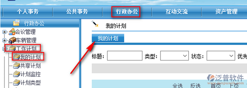進入我們的OA系統(tǒng)界面點擊【行政辦公】--【工作計劃】--【我的計劃】,可見到如下圖所示。