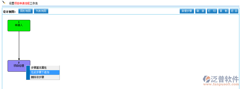 7、第二節(jié)點設(shè)置名稱“項目經(jīng)理”,步驟位置“中間段”,設(shè)置【經(jīng)辦人轉(zhuǎn)交】【自動選擇條件】【回退選項】