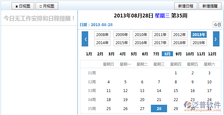 如上圖,右側(cè)為日歷,選擇相應(yīng)的日期后(藍(lán)色背景表示已選中,日歷的左上會(huì)顯示你所選擇的日期),點(diǎn)擊【日視圖】或【月視圖】按鈕,日視圖則是查看選擇日期內(nèi)的“日”中的日程和提醒,月視圖則是查看選擇日期內(nèi)月份內(nèi)的所有日程和提醒。