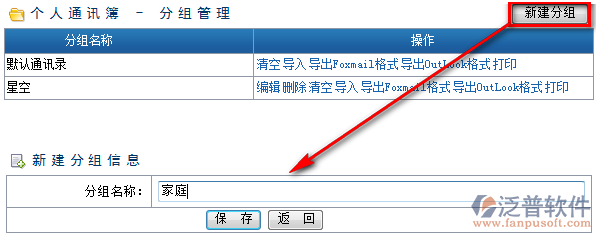 通訊簿分組便于查找、管理。添加聯(lián)系人之前先創(chuàng)建分組(已創(chuàng)建則不需要走這步),點(diǎn)擊分組管理來(lái)到下圖頁(yè)面,點(diǎn)擊右上角的<新建分組>便會(huì)跳轉(zhuǎn)到新建分組的編輯頁(yè)面,如下圖箭頭所指。填好分組名點(diǎn)擊<保存>即可。對(duì)已建好的通訊分組還可以進(jìn)行編輯(修改)、刪除、清空(清空分組內(nèi)所有信息)、導(dǎo)出、打印操作,下面分別演示個(gè)人通訊簿分組和公共通訊簿分組的創(chuàng)建。