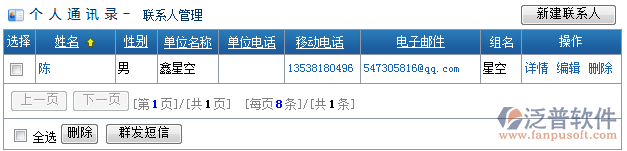 在這可查看聯(lián)系人的詳細(xì)信息,新建、編輯(修改)、刪除聯(lián)系人信息。還可選中聯(lián)系人發(fā)送短信。