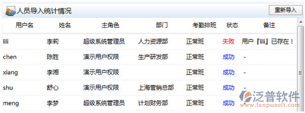狀態(tài)顯示成功的用戶即成功導(dǎo)入,顯示失敗狀態(tài)的在備注中會顯示失敗的原因,如用戶名重名,用戶用戶姓名沒有填寫,沒有指定考勤排班等。在excel表格中修改導(dǎo)入失敗的用戶信息后可重新導(dǎo)入。