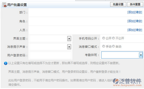 用于管理員批量設(shè)置用戶信息。包括主題界面、消息彈出方式、用戶登錄密碼等。