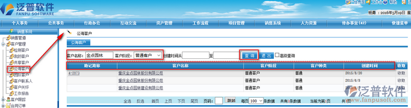 1、1、進入到我們的OA系統(tǒng),打開【客戶管理】--【公海客戶】即可了解到我們當前有哪些客戶,在錄入新客戶的時候還可查詢是否已經(jīng)擁有。如下圖所示: