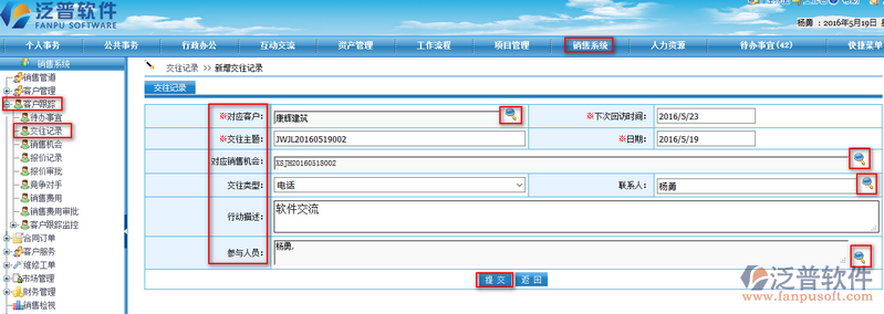 2、點(diǎn)擊頁面右上角的【增加】可新增新的客戶交往信息,我們可添加對應(yīng)的客戶、主題、下次回訪的時間、機(jī)會選擇交往的類型等,編輯完成后點(diǎn)擊【提交】可完成我們的交往記錄。如下圖所示: