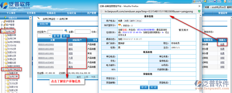 3、點(diǎn)擊創(chuàng)建人即可了創(chuàng)建人的詳細(xì)信息,并可以與之交流,了解合同的詳細(xì)情況,還可對合同訂單做修改操作。如下圖所示: