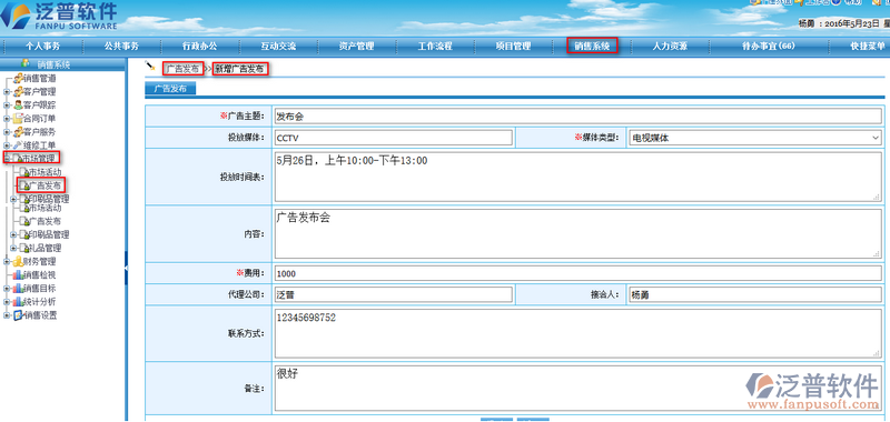 1、進(jìn)入到我們的OA系統(tǒng),打開【銷售系統(tǒng)】--【市場(chǎng)管理】--【公告發(fā)布】了解到當(dāng)前有哪些新的消息。如下圖所示: