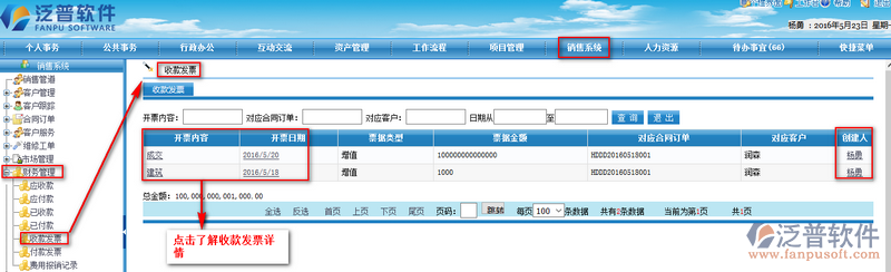進(jìn)入到我們的OA系統(tǒng),打開【銷售系統(tǒng)】--【財(cái)務(wù)管理】--【收款發(fā)票】可了解我們當(dāng)前哪些客戶已經(jīng)收款及其對(duì)應(yīng)的客戶信息和合同信息,還可查看詳細(xì)的發(fā)票信息,看與我們的上報(bào)金額是否一致,點(diǎn)擊創(chuàng)建人還可了解創(chuàng)建人的詳細(xì)信息,還可與之交流詢問發(fā)票的具體事宜。如下圖所示: