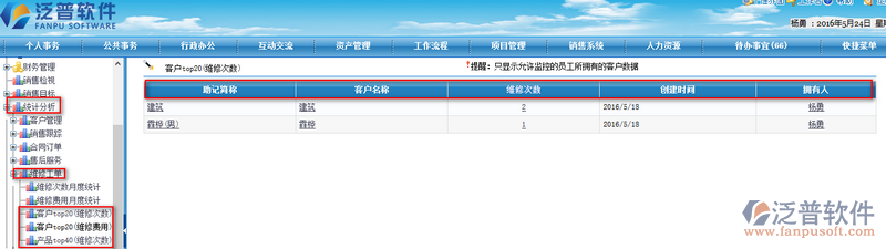 1、進(jìn)入到我們的OA系統(tǒng),打開(kāi)【銷售系統(tǒng)】--【統(tǒng)計(jì)分析】--【維修工單】點(diǎn)擊【客戶top20(維修次數(shù))】看我查看維修次數(shù)前20的的客戶,以列表是的形式展示給我們,如下圖所示: