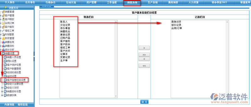 二、通過【銷售系統(tǒng)】——【銷售設置】——【客戶信息欄目設置】可以進入到客戶信息欄目的頁面,在待選欄目中進行選擇即可,如下圖所示