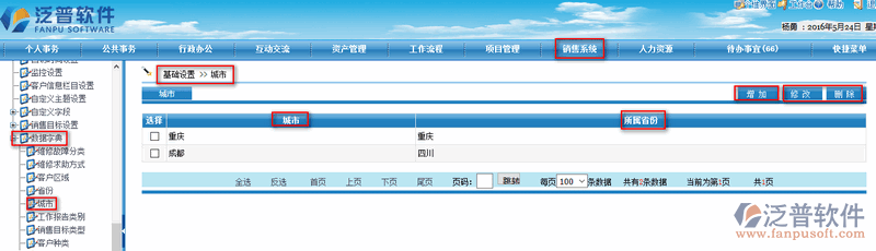 1、進入到我們的OA系統(tǒng),在【銷售系統(tǒng)】--【銷售設置】--【數(shù)據(jù)字典】--【城市】中可將我們的客戶進行分類管理,如下圖所示: