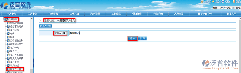 2、在【客戶聯(lián)系人】頁面點擊右上角的【增加】可增加新的類別也可選中原來的分類做修改、刪除操作,編輯完畢后點擊【提交】即可新增成功,如下圖所示: