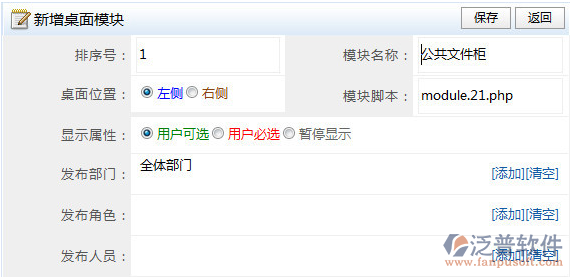 點擊“系統(tǒng)設置”——“系統(tǒng)界面設置”——“桌面模塊設置”開啟此功能,如下圖所示,模塊名稱為公共文件柜,模塊腳本為module.21.php,選擇發(fā)布范圍,保存即可。
