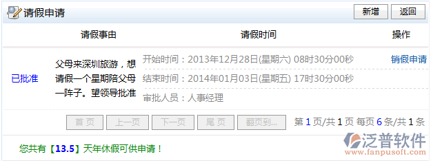 填寫完請假信息后點(diǎn)擊右上角的【保存】按鈕,考勤審批人員就會收到請假申請信息,審批人員審批以后,在請假申請記錄列表頁面就會顯示審批結(jié)果信息。