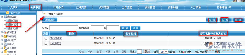 增加成功后可在通告管理中看到標題、發(fā)布部門、發(fā)布人,如下:
