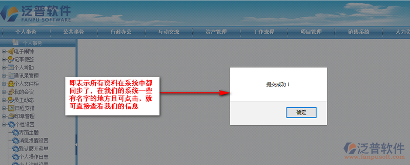 資料完善之后點(diǎn)擊【提交】,出現(xiàn)如下圖窗口則表示我們提交成功,所有數(shù)據(jù)在我們的OA系統(tǒng)中將同步。
