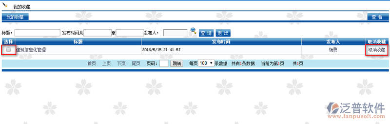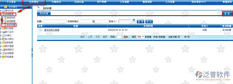 通過【公共事務(wù)】——【新聞管理】——【我的收藏】,進(jìn)入”我的收藏“頁面,頁面顯示了,我所有的收藏內(nèi)容,選中一條新聞,單擊【查看】按鈕,可以查看此新聞的詳情內(nèi)容。