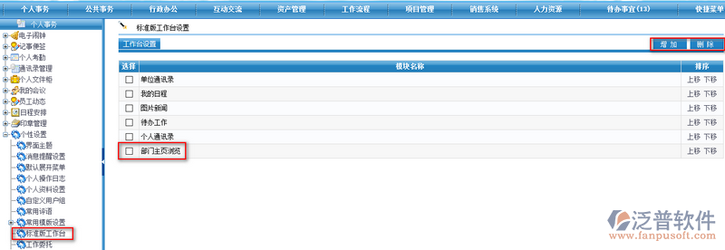 選中“部門主頁瀏覽”,完成添加后在我們的【標準工作臺】可看到我們新增的工作臺,擺放的位置可以進行上下移動,如下圖所示:
