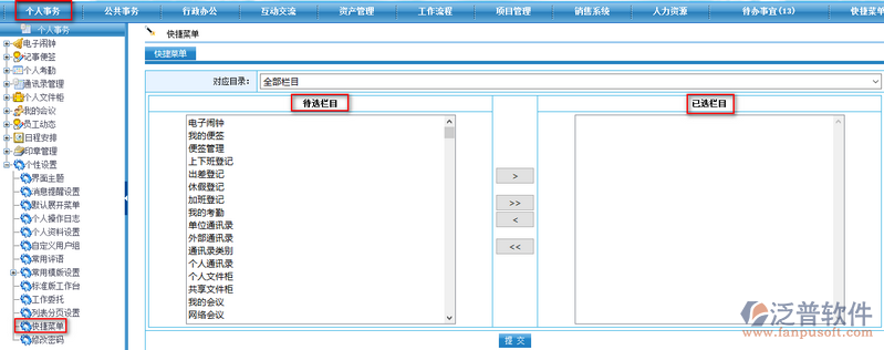 3、選中一個【個人事務】與oa主界面的‘個人事務’相對應。待選欄目為我們的所有的欄目,可添加到個人事務欄目之下,選擇完畢點擊【提交】,即可完成快捷菜單的配置,具體操作如下圖所示: