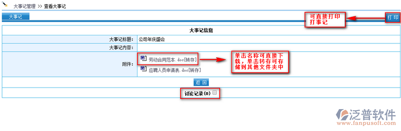 查看頁面如圖所示。點擊【打印】按鈕,可直接進行打印;點擊附件中的文件名稱,可直接下載附件,點擊【轉存】按鈕,可將附件轉存到其他文件夾下。下方的參與討論操作,請參考文章《如何瀏覽通知》里的詳細介紹