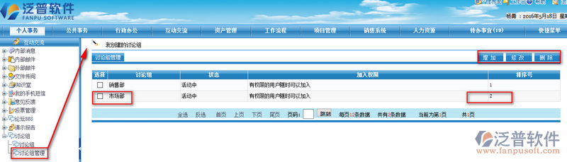 3、完成編輯后點(diǎn)擊【提交】,則我們新建討論組成功。選中一個(gè)討論組我們可進(jìn)行修改、刪除操作。如下圖所示: