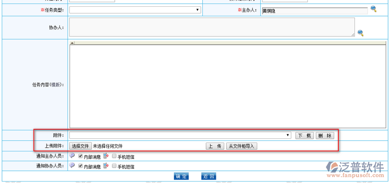 最后,選擇通知人員,任務(wù)安排的方式,分為內(nèi)部消息和手機(jī)短信2種提醒模式,可同時選擇。填寫完所有選項后,單擊確定,完成新增操作。