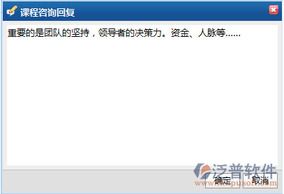 如下圖所示,輸入回復(fù)的內(nèi)容,點擊確定即可?;貜?fù)之后咨詢?nèi)藛T可以在課程咨詢中查看到該回復(fù)的內(nèi)容。