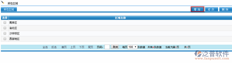 單擊左側(cè)【所屬區(qū)域】按鈕,進(jìn)入,所屬區(qū)域設(shè)置頁(yè)面,頁(yè)面顯示出已建的區(qū)域。單擊【增加】按鈕,新增一個(gè)區(qū)域