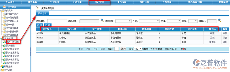 通過【資產管理】——【資產管理】——【資產分布列表】,進入資產申請頁面,如下圖所示,頁面顯示了擁有資產的情況。頁面快速羅列出了,資產目前所在的地方,在何人手中,資產的來源方式,等相關信息。幫助我們快速了解資產的情況。