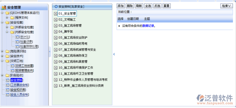 本模塊的功能包括:安全管理、文明施工、施工現(xiàn)場(chǎng)管理、腳手架、施工現(xiàn)場(chǎng)安全防護(hù)、施工現(xiàn)場(chǎng)臨時(shí)用電、施工現(xiàn)場(chǎng)機(jī)械管理與安全、施工現(xiàn)場(chǎng)消防保衛(wèi)、施工現(xiàn)場(chǎng)料具管理、施工現(xiàn)場(chǎng)環(huán)境保護(hù)工作、施工現(xiàn)場(chǎng)環(huán)衛(wèi)衛(wèi)生管理、特種作業(yè)操作人員管理與培訓(xùn)考核、新表_施工現(xiàn)場(chǎng)安全資料分類表。