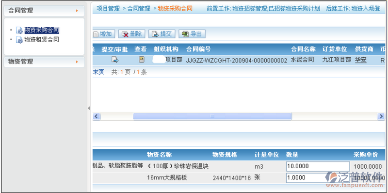 步驟2:在子表物資采購合同明細(xì)中,點(diǎn)擊“增加”,從采購計劃中選擇物資,如下圖所示: