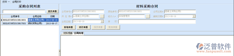 “材料采購管理”下的“材料采購合同”(用于填寫與供應(yīng)商簽訂的采購合同的記錄合同的材料數(shù)量和單價(jià)及合同內(nèi)容的簡(jiǎn)介)。操作方式與預(yù)算計(jì)劃和采購計(jì)劃單一樣,這里不做過多介紹。