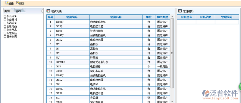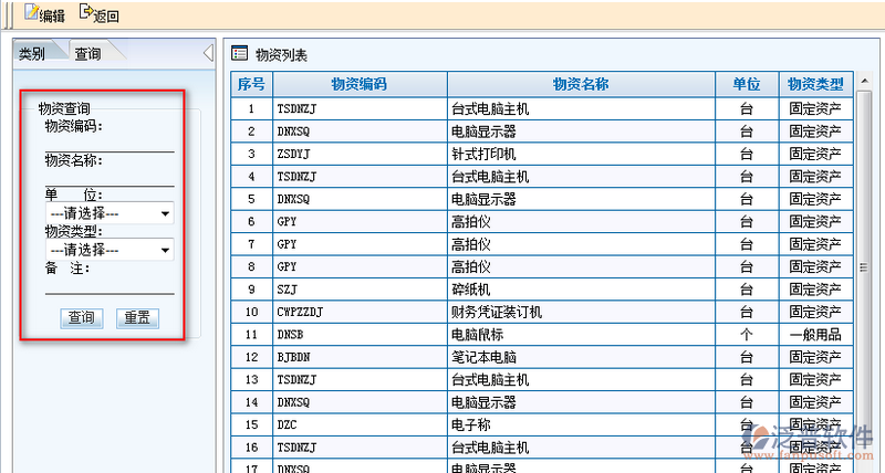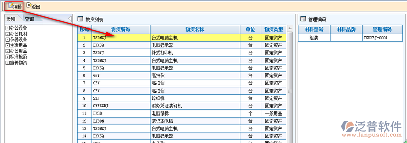 4、選中倉庫中的物資名稱,點擊【編輯】即可進行相關物資的修改。如圖: