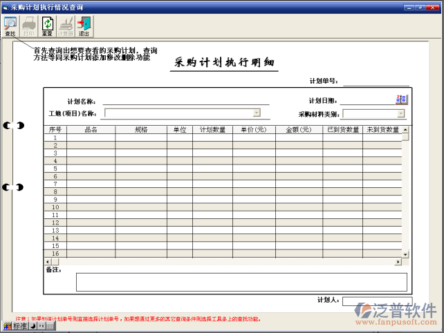 計(jì)劃執(zhí)行情況查詢(xún)將能實(shí)時(shí)顯示出該采購(gòu)計(jì)劃執(zhí)行的情況,反映出到貨數(shù)量和未到貨數(shù)量。查詢(xún)方法同計(jì)劃登記修改刪除中的查詢(xún)。